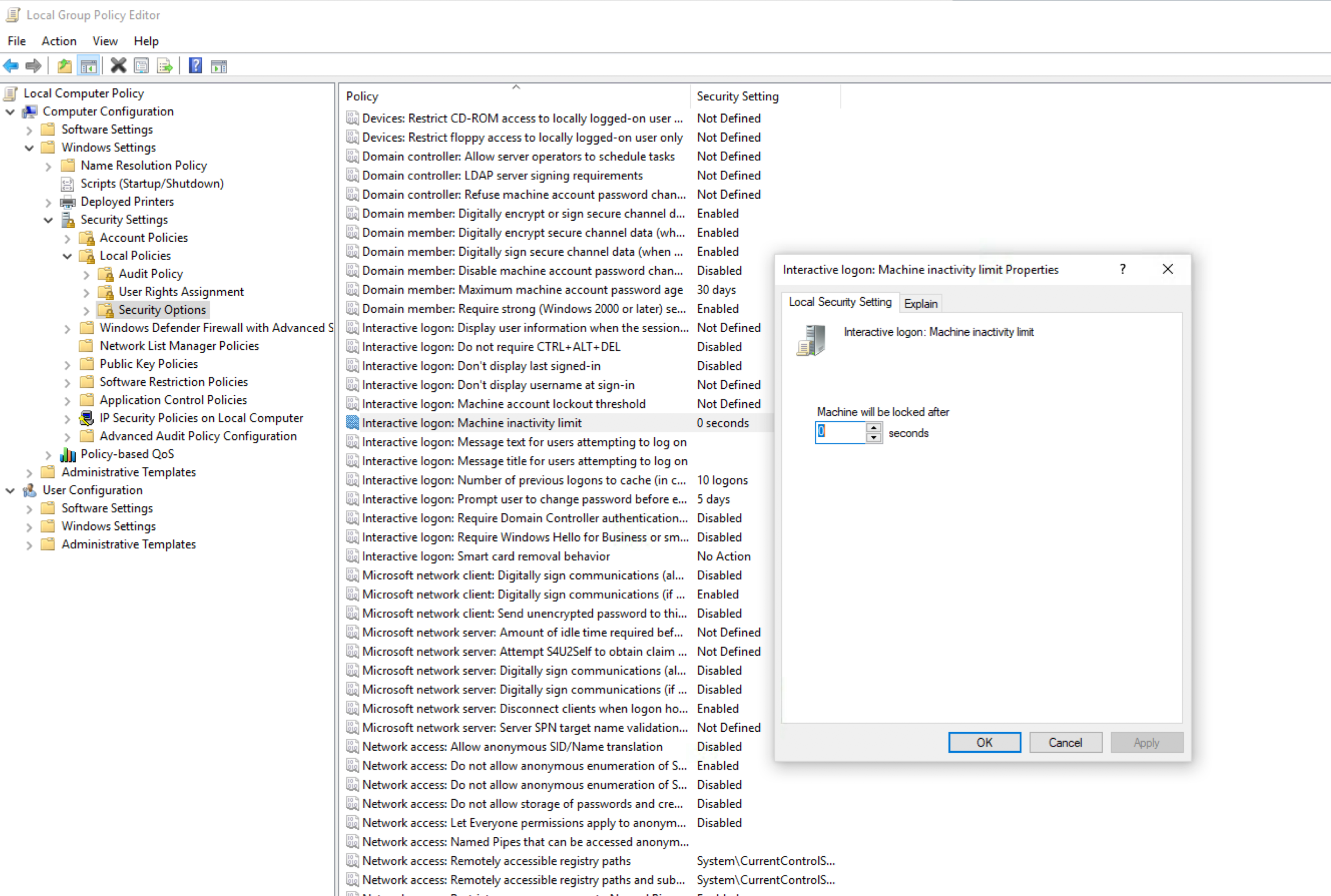 3. Double click on "Interactive logon: Machine inactivity limit" and change the value to 0.