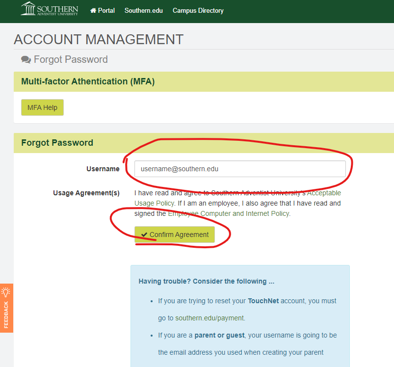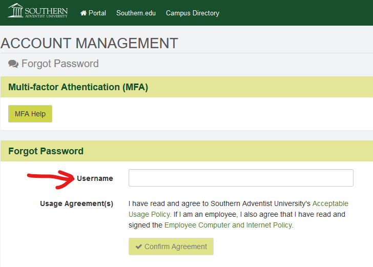 1. Goto https://myaccess.southern.edu/mvc/AccountManagement/i/Forgot and enter your Southern email address in the Username field.