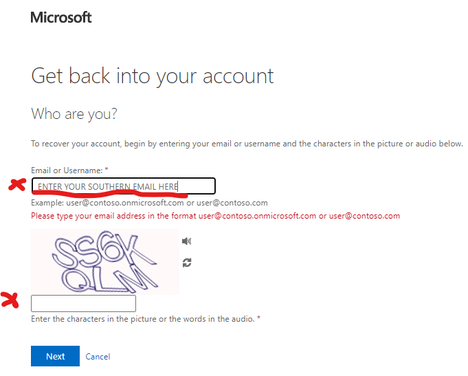 2. Enter your Southern email address in the Email field and solve the Captcha line, then click Next.