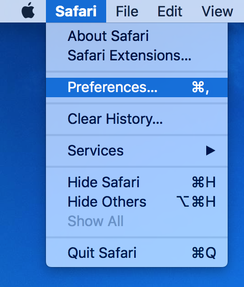 - Click "Safari" in the upper left hand side. When the menu appears, click "Preferences"