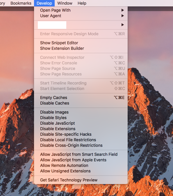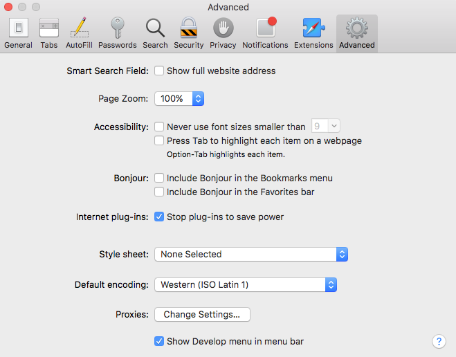 - In the window that appears, click the Advanced tab. Check the box at the bottom that says Show Develop menu...