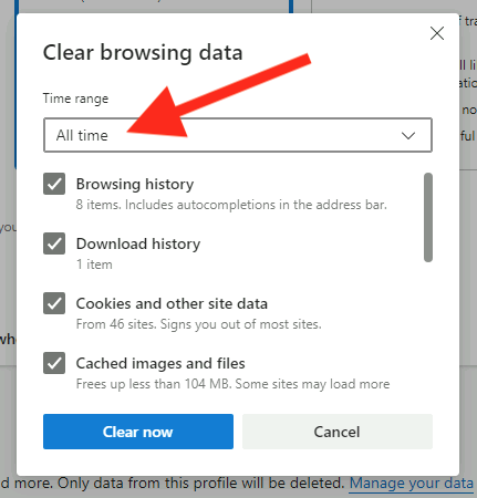 - Select "All time" under time range and check all the boxes below and click "Clear now"
