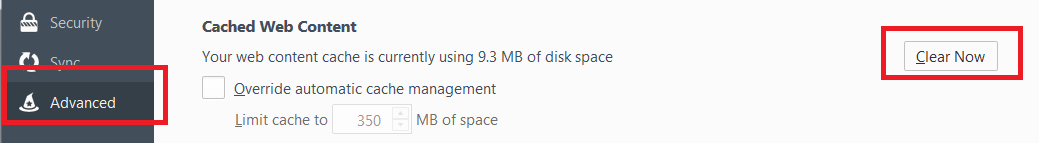 - Options > Advanced (left side) > Cached Web Content > Clear Now