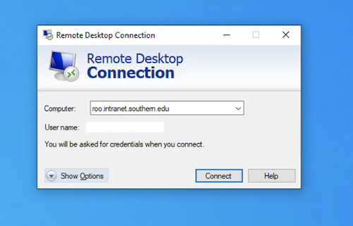 - In Remote Desktop Connection, type roo.intranet.southern.edu and then select Connect.