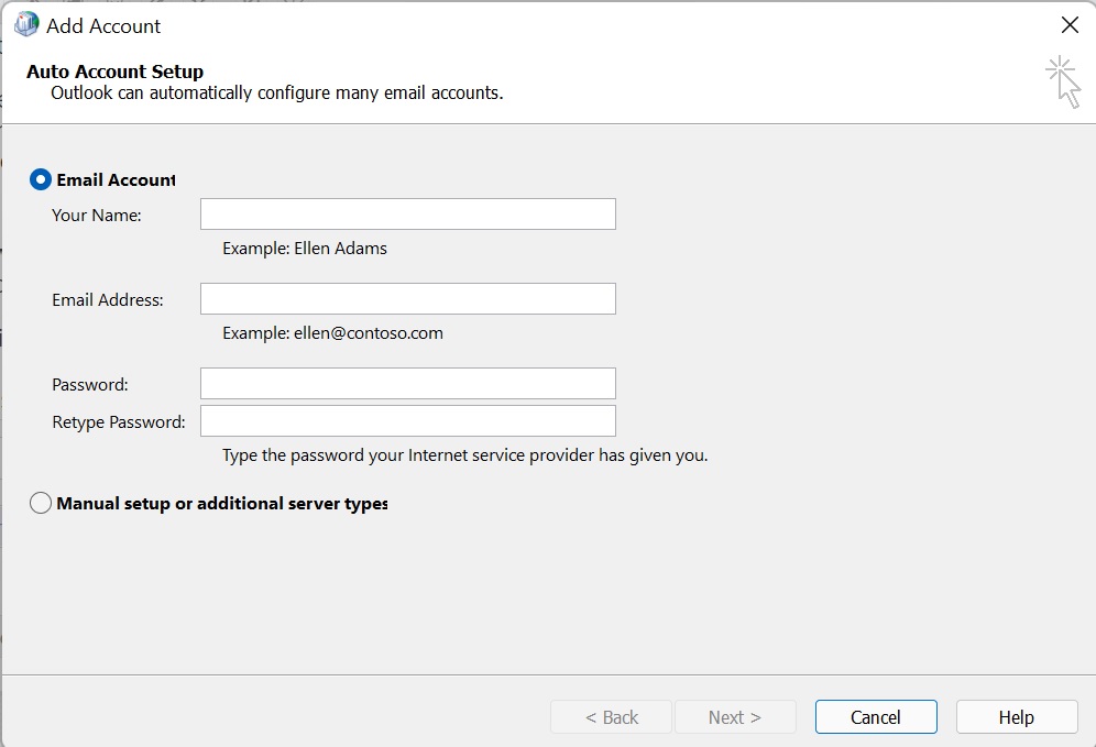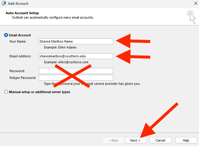- The Add Account window will open and you can enter the Name, Email Address of the Shared Mailbox and then click Next. *DO NOT ENTER A PASSWORD