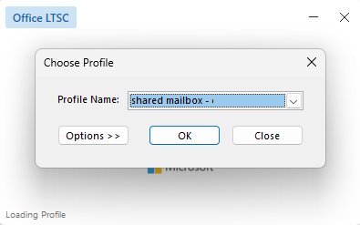 8. The Shared Mailbox has now been added to Outlook as its own Profile. When you open Outlook, you will be given a choice of which profile to open, your own email or the Shared Mailbox.