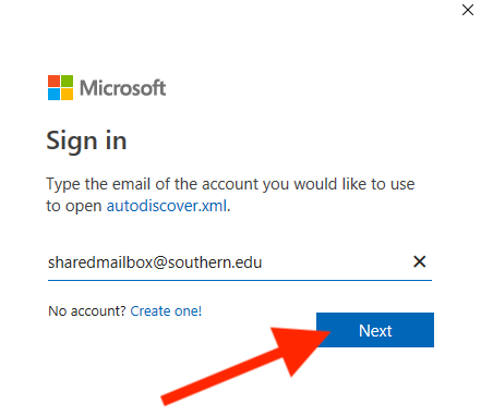 - You will then be presented with a Microsoft Sign In window. Enter the full Shared Mailbox email address and click Next.