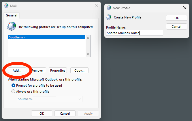 - Make sure "Prompt for a profile to be used" is selected and then click "Add" and name your Shared Mailbox profile.