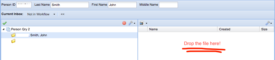 3. Click on the name of the person that you want to upload the file for. Then drag and drop the file in the area shown in the following image (where it says "Drop the file here!"). This step assumes that you have a file ready to be uploaded, normally a PDF file.