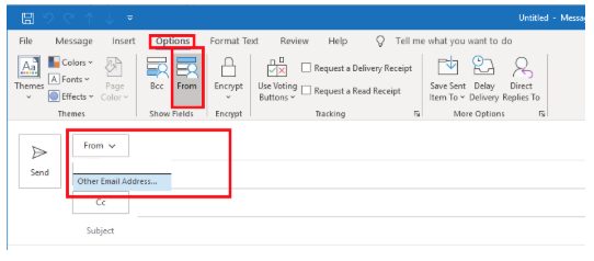 If the From button isn't showing in the new message window, click the Options tab and then select From.