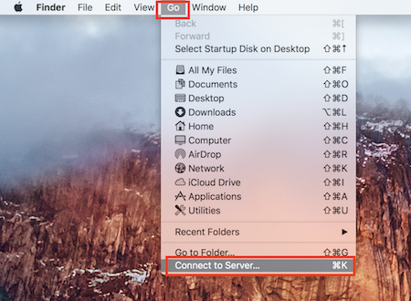 Step 2: Click on the "Go" menu and then select "Connect to server" all the way at the bottom.