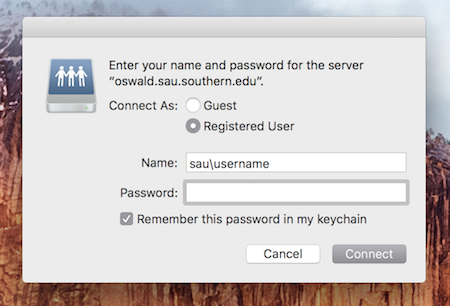Step 5: You will be prompted for your credentials. type sau\ before your username. Then enter your password, select "Remember this password in my keychain" and "Connect." (Only select the remember password option if your computer is secured with a login password)
