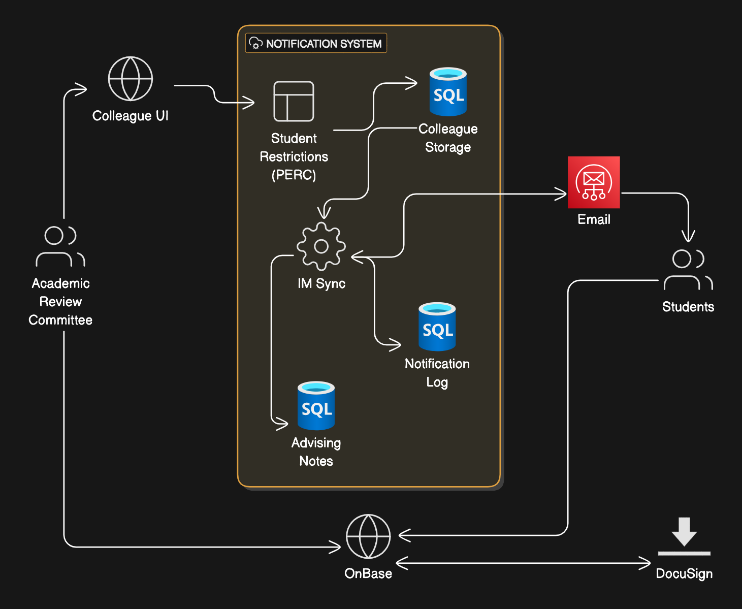 An academic hold should be added to the student record to send academic status notifications to students automatically. You can use the PERC screen to add those holds.