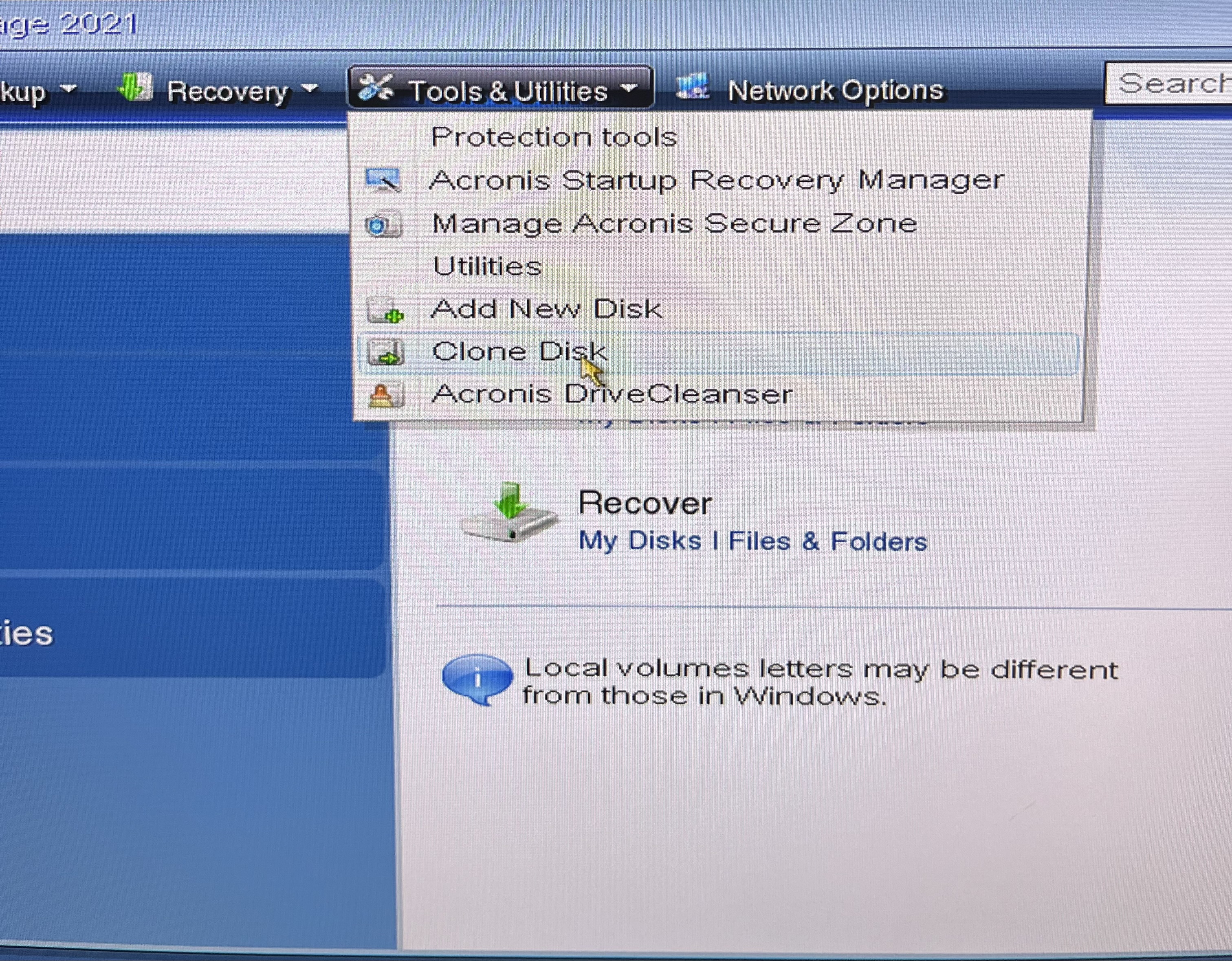 Now that we are in Acronis, select Tools & Utilities > Clone Disk