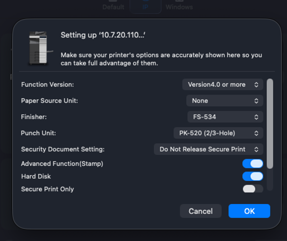 Many printer related issues on a user’s MacBook, including missing hole punching and stapling options, can often be resolved by removing and reinstalling the printer on the MacBook using the correct configurations. The following steps explain how to add the printer properly so the missing features become available.